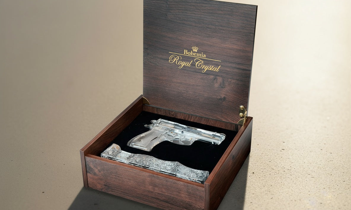 Crafted from 100% pure Bohemian crystal, the design blends modern contouring with traditional European glassmaking. Over 7 hours of meticulous hand-finishing bring the piece to life, from the grip to the beveled barrel lines, every element forged with deliberate precision.