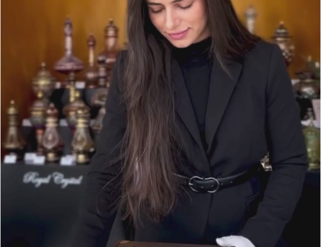Your order arrives in a custom oak viewing box made in Portugal. We line the box with velvet foam to keep the crystal safe. Included are white gloves for handling and a certificate of authenticity. It is a complete luxury experience from the moment it arrives.