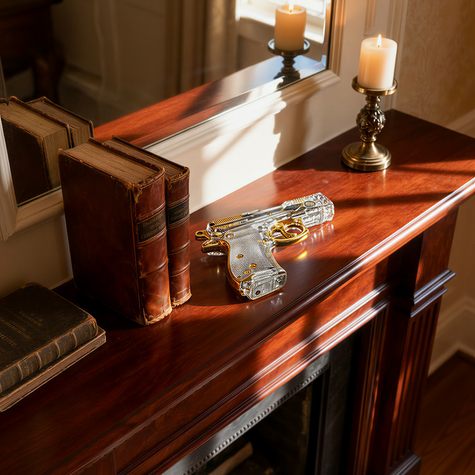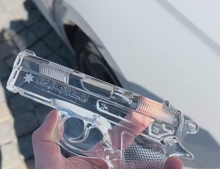 Clear gun-shaped object on a wooden shelf with books