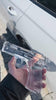 Model of a handgun on a clear stand against a white background