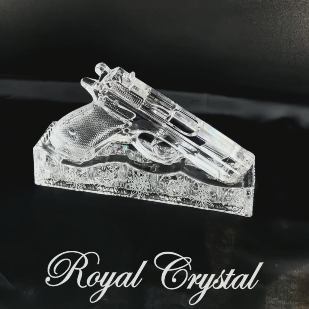 Clear crystal sculpture of a handgun on a reflective surface with a gray background
